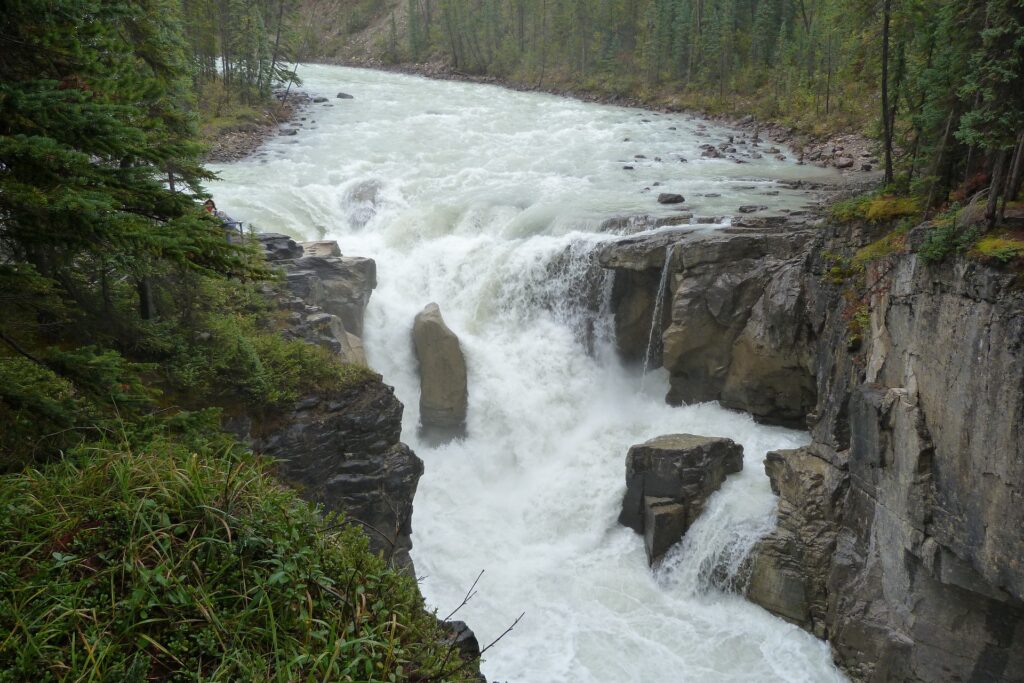 - Athabasca Falls: Located just outside of Jasper, Athabasca Falls is a powerful waterfall on the Athabasca River. There are paved walking paths and viewing platforms that provide excellent vantage points to witness the force and beauty of the falls.