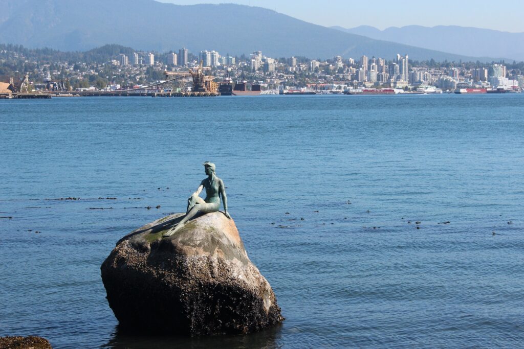 “Girl in a Wetsuit” is a famous sculpture is situated in the waters of Stanley Park, near the Vancouver Rowing Club. The sculpture depicts a female figure sitting on a rock, wearing a wetsuit, and looking out towards the Burrard Inlet.